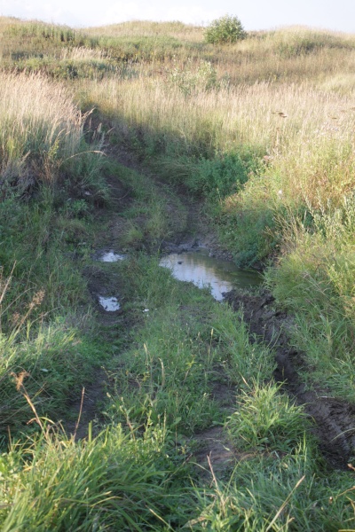 Ладно, раз вышеупомянутое устройство показывает, что дорога есть, значит она где-то есть. В конце концов, если верить карте, асфальт к той деревне, в которую нас ведёт это "бесовское устройство", не подходит, а значит дорога к ней отсюда дожлна быть точно просто, видимо, составители карт немного ошиблись (кстати, ещё на въезде в эту деревню я обратил внимание на расхождение реальных координат с координатами дорог на карте; может, конечно, это была погрешность, но в таком случае она слишком постоянная, поскольку на этой дороге в пределах деревни и небольшой зоны вокруг неё все повороты "бились" с одинаковым сдвигом). С такой мыслью мы свернули на колею в поле, которая вывела нас обратно в деревню! Видимо, местные придумали такой вот объезд, чтобы не беспокоить жителей угловых домов. За деревней развилка. Поскольку время уже позднее, решаем дальше не продвигаться, а попробовать разведать левую дорогу, которая, если верить направлению, приведёт нас к озеру. Сказано сделано: свернули, едем. Дорога хорошая, ровная, колей нет... ой! Кажется, это была хорошая колея. Сдаём назад, выходим, смотрим и верно: прямо колея, слева болото. Штурман уходит на разведку, и возвращается с новостями: дальше дорога лучше, так что рискнуть теоретически можно. Но потом метров этак через сто колея сужается, а ещё через сто превращается в тропинку, которой, конечно, пользуются, но очень редко. Получив такие разведданные, решаем встать на ночлег прямо тут, в поле, а завтра уже выбираться в город и, если получится, искать живописные виды на берегу озера для проведения фотосъёмки... тем более, что такие фотографии в интерете есть.